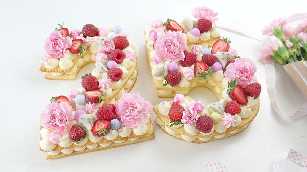 Торт "Мильфей" в виде цифры 25, украшенные красивыми цветами и вкусными ягодками.